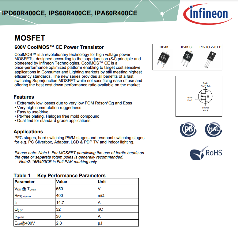 6R400CE IPD60R400CE N Channal 650V 14.7A มอสเฟต TO-252