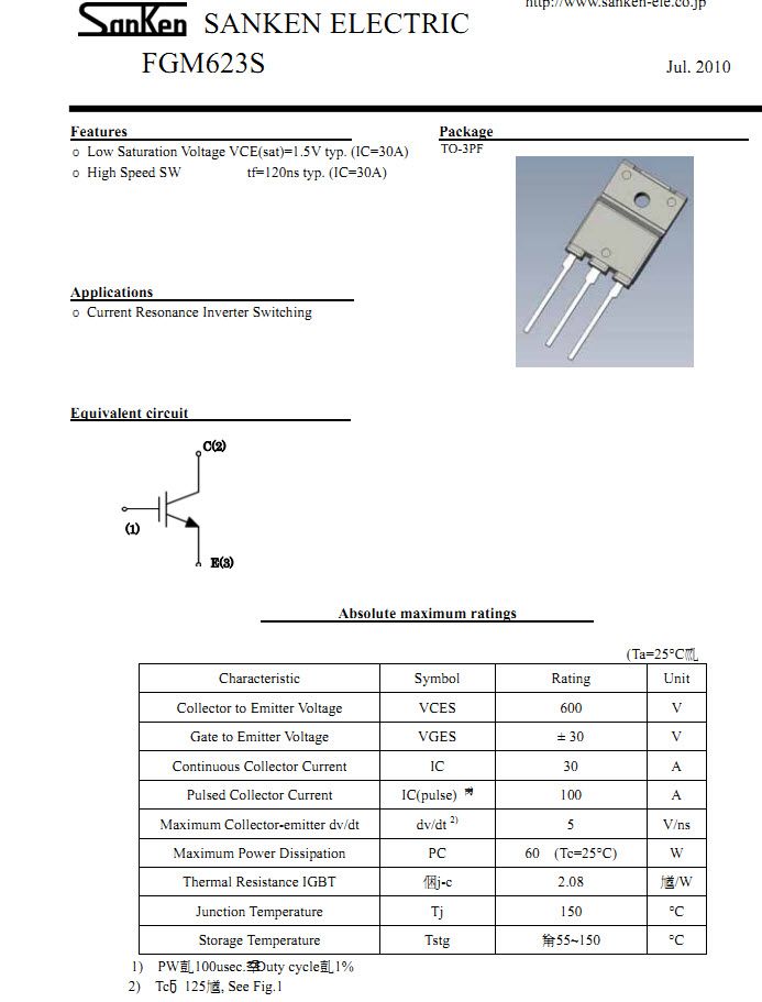 FGM623S 600V 30A IGBT ไม่มีแดมป์ TO-3PF