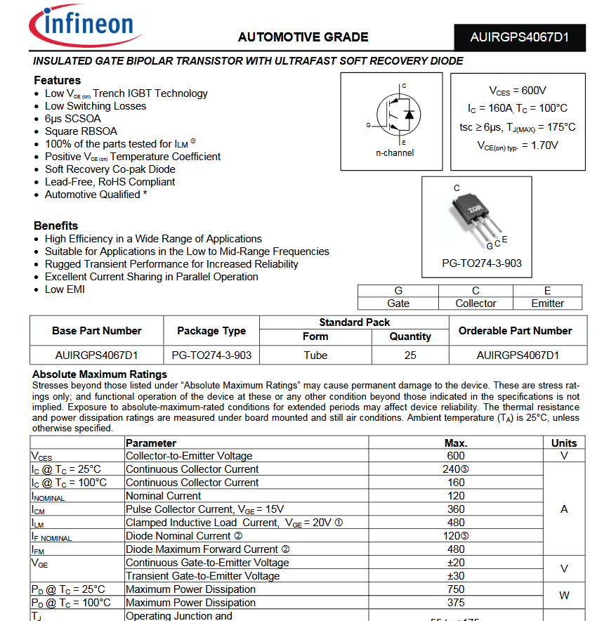 AUPS4067D1 600V 120A IGBT N-Channal TO-274-3 สินค้าถอด ชิพใหญ่