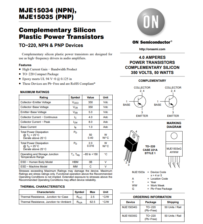MJE15034G MJE15035G 350V 4A ทรานซิสเตอร์ สินค้าคู่ละ แท้