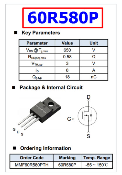 60R580P MOSFET N 600V 8A TO-220 ใส่ภาคจ่ายไฟ